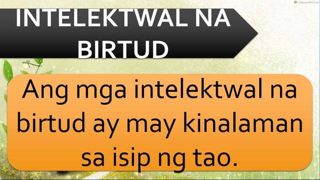 Ang mga katangian ng pagkalalaki tulad ng. Nagmula ang birtud o virtue mula sa salitang latin na virtus vir. Ang intelektuwal na birtud ay may kinalaman sa isip ng tao gawing kaalaman habit of knowledge.